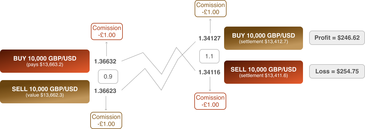 Commissions are charged when you open and close a trade. In this example, the commission charged is £10 per Lot. Once adjusted according to the trade size of 0.1 Lots the commission becomes £1.00. When converted to dollars, it becomes approximately $1.35.