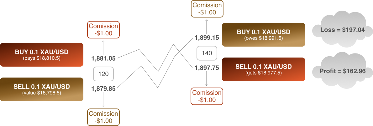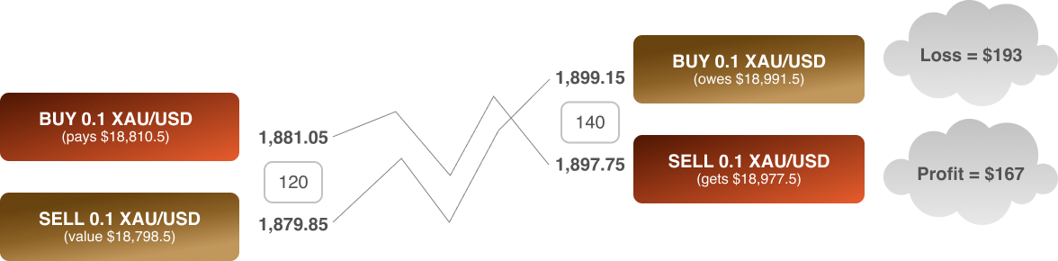 The spread is the difference between the bid and Ask-price. When you enter a long trade, your order is opened using the Ask-price, which is the higher of the two quotes. When the long trade is closed, the Bid-price, which is the lower of the two quotes. If the spread on XAU/USD is 120, it means the difference between the price you buy at, and the price you sell at is $1.20.