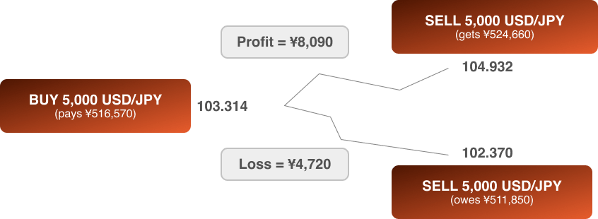 When you go long on USD/JPY, you’re theoretically buying dollars with yen. When you close the trade, it’s offset with another order in the opposite direction. The difference between the opening order and closing order determine the amount of profit or loss. Your profit or loss will be calculated in JPY. If the dollar strengthened against the yen, you’d get more yen when you close the transaction. If the dollar weakened, you’d get back fewer yen.